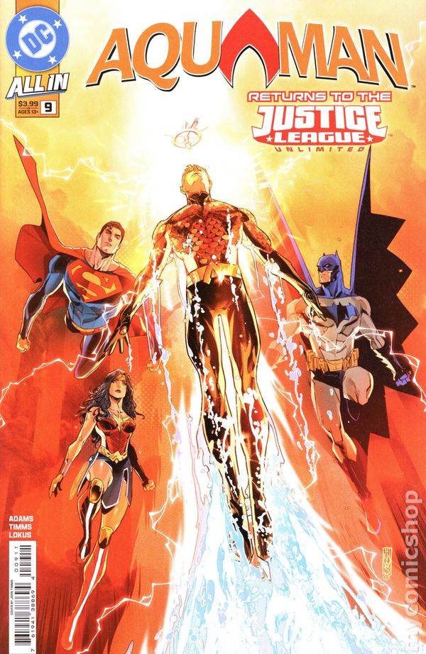 Written by Jeremy Adams. Art by John Timms. Cover by John Timms. REUNITED WITH THE JUSTICE LEAGUE! Aquaman has returned to Earth with new powers, new allies, and a new chance to be a father...all while a new mystery emerges from the depths of Atlantis! After the devastating events of the Battle of Dagon, Aquaman's so-called Justice League Blue must regroup and refocus their efforts on Earth...and the return of one of the King of the Seven Seas' deadliest enemies! 28 pages, full color. Rated T+ Cover price $3.99.