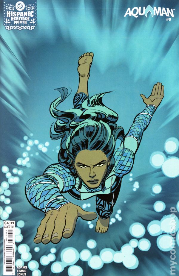 Written by Jeremy Adams. Art by John Timms. Cover by Lesley Leirix Li. REUNITED WITH THE JUSTICE LEAGUE! Aquaman has returned to Earth with new powers, new allies, and a new chance to be a father...all while a new mystery emerges from the depths of Atlantis! After the devastating events of the Battle of Dagon, Aquaman's so-called Justice League Blue must regroup and refocus their efforts on Earth...and the return of one of the King of the Seven Seas' deadliest enemies! 32 pages, full color. Rated T+ Cover price $4.99.