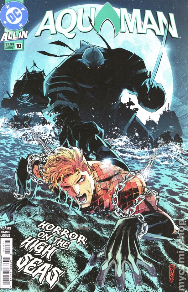 Written by Jeremy Adams. Art by John Timms. Cover by John Timms. THE DARK TIDE RETURNS! Cursed treasure! Ghost pirates! Spooky mysteries abound as darkness rises from the deep, awakening creatures long since dead. Something is infecting the high seas, and its up to Aquaman, the avatar of the Blue, to defend it before its too late! 32 pages, full color, rated 13+. Cover price $3.99.