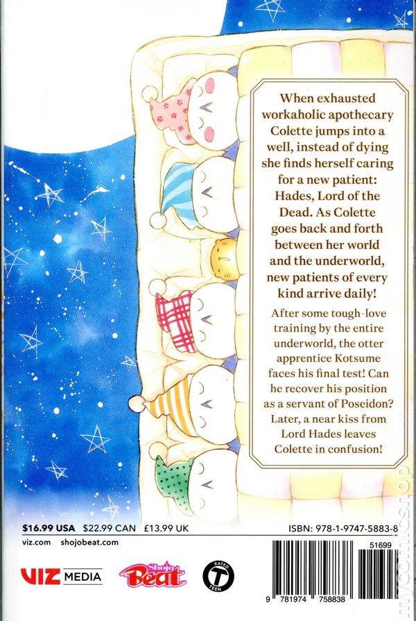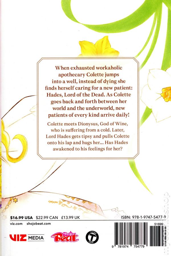 Volume 4 - 1st printing. Story and art by Yukimura. Translated and Adapted by Max Greenway. Colette, an overworked apothecary, finds romance and a new lease on life-in the underworld!! When exhausted workaholic apothecary Colette jumps into a well, instead of dying she finds herself caring for a new patient: Hades, Lord of the Dead. As Colette goes back and forth between her world and the underworld, new patients of every kind arrive daily! Colette's eventful visit home continues with sibling apprentices, an old friend, and the twelve Olympians! In addition, her time spent with Lord Hades becomes even sweeter... Softcover, 5-in. x 7-in., 384 pages, B&W. Teen Cover price $16.99.