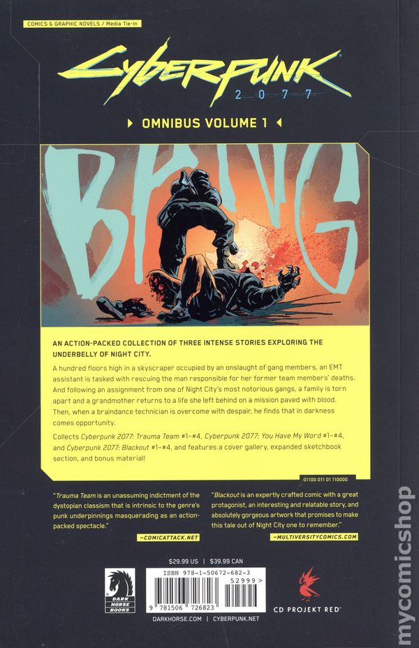 2nd and later printings. Collects Cyberpunk 2077: Trauma Team (2020 Dark Horse) #1-4, Cyberpunk 2077: You Have My Word (2021 Dark Horse) #1-4, and Cyberpunk 2077: Blackout (2022 Dark Horse) #1-4. Written by Cullen Bunn and Bartosz Sztybor. Art by Miguel Valderrama, Jesus Hervas, and Roberto Ricci. Cover by Mattia De Iulis. Back Cover by Jesus Hervas. A collection of over 300 pages of blood, flesh, and steel cyberpunk action! In Trauma Team, the sole surviving member of a trauma team squad goes back into the field only to face her living nightmare once again. In You Have My Word, a family is torn apart, forcing a grandmother to return to a life she left behind to seek revenge. And in Blackout, a braindance technician fights his inner demons while planning the perfect heist. Features a cover gallery and expanded sketchbook section! Softcover, 328 pages, full color. Mature Readers Cover price $29.99.