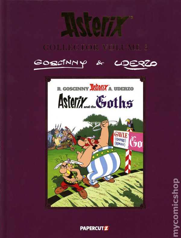 Volume 3 - 1st printing. "Asterix and the Goths!" Written by Rene Goscinny. Art and cover by Albert Uderzo. Translated by Joe Johnson and Nanette McGuinness. Asterix and Obelix join their wise druid, Panoramix, for a journey to the annual druids conference in Asterix and the Goths. But outside of the conference, Goths lie in wait, hoping to kidnap a druid! Can our heroes protect Panoramix and the magic potion which gives them super strength? This comic has been lovingly republished with new background on the creators and the creative process. Rebound in a special-edition gold foil treatment and perfect for Asterix fans of all ages. Hardcover, 10-in. x 13-in., 72 pages, full color. Cover price $19.99.