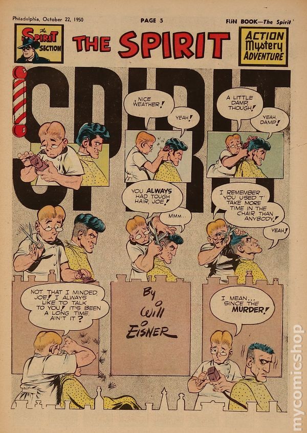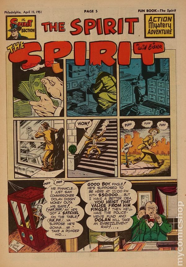 November 5, 1950. Spirit Weekly Newspaper section. Scripts by Eisner or Feiffer, or Eisner/Feiffer, or Nordling. Art by Eisner with backgrounds by Eisner, Grandenetti, Le Blanc, Stallman, Nordling, Dixon and/or others except where noted. Tabloid Sized Newsprint, 10-3/4" x 15", 8 pages, full color.
