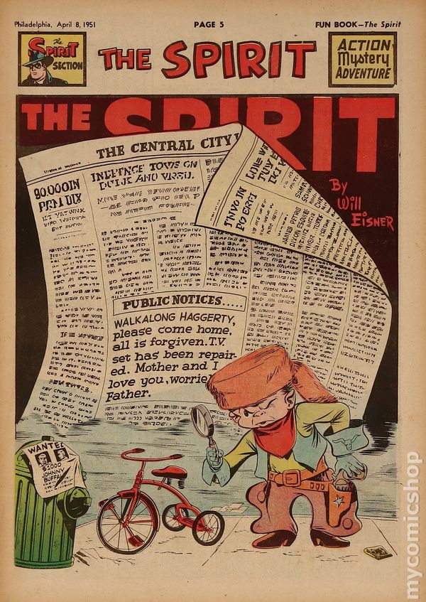 December 3, 1950. Spirit Weekly Newspaper section. Scripts by Eisner or Feiffer, or Eisner/Feiffer, or Nordling. Art by Eisner with backgrounds by Eisner, Grandenetti, Le Blanc, Stallman, Nordling, Dixon and/or others except where noted. Tabloid Sized Newsprint, 10-3/4" x 15", 8 pages, full color.