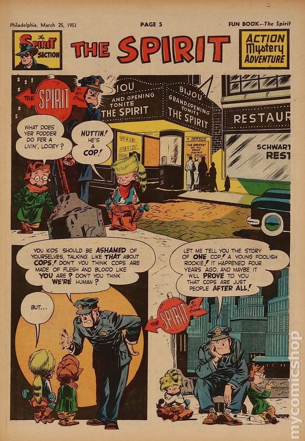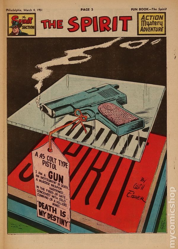 March 25, 1950. Spirit Weekly Newspaper section. Scripts by Eisner or Feiffer, or Eisner/Feiffer, or Nordling. Art by Eisner with backgrounds by Eisner, Grandenetti, Le Blanc, Stallman, Nordling, Dixon and/or others except where noted. Tabloid Sized Newsprint, 10-3/4" x 15", 8 pages, full color.