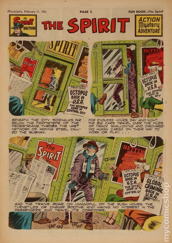 March 11, 1950. Spirit Weekly Newspaper section. Scripts by Eisner or Feiffer, or Eisner/Feiffer, or Nordling. Art by Eisner with backgrounds by Eisner, Grandenetti, Le Blanc, Stallman, Nordling, Dixon and/or others except where noted. Tabloid Sized Newsprint, 10-3/4" x 15", 8 pages, full color.