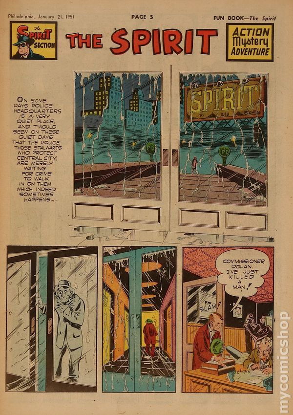 January 21, 1950. Spirit Weekly Newspaper section. Scripts by Eisner or Feiffer, or Eisner/Feiffer, or Nordling. Art by Eisner with backgrounds by Eisner, Grandenetti, Le Blanc, Stallman, Nordling, Dixon and/or others except where noted. Tabloid Sized Newsprint, 10-3/4" x 15", 8 pages, full color.