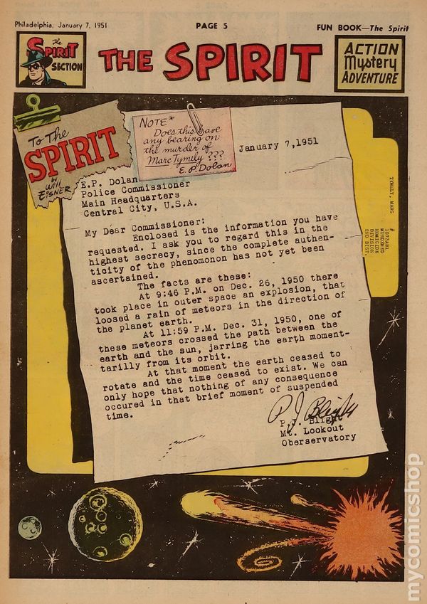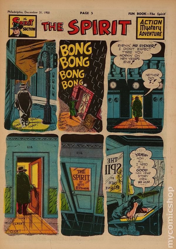 December 31, 1950. Spirit Weekly Newspaper section. Scripts by Eisner or Feiffer, or Eisner/Feiffer, or Nordling. Art by Eisner with backgrounds by Eisner, Grandenetti, Le Blanc, Stallman, Nordling, Dixon and/or others except where noted. Tabloid Sized Newsprint, 10-3/4" x 15", 8 pages, full color.