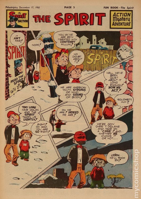 December 17, 1950. Spirit Weekly Newspaper section. Scripts by Eisner or Feiffer, or Eisner/Feiffer, or Nordling. Art by Eisner with backgrounds by Eisner, Grandenetti, Le Blanc, Stallman, Nordling, Dixon and/or others except where noted. Tabloid Sized Newsprint, 10-3/4" x 15", 8 pages, full color.