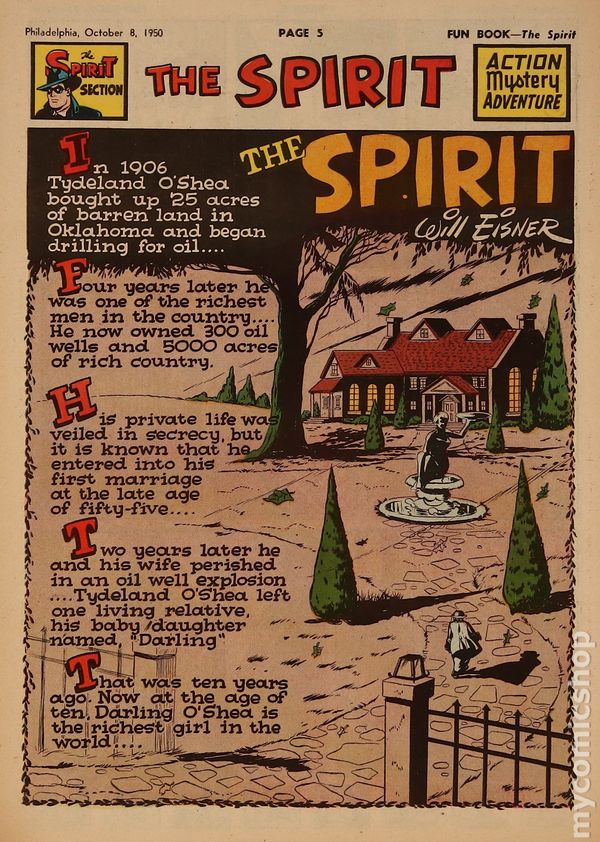 October 1, 1950. Spirit Weekly Newspaper section. Scripts by Eisner or Feiffer, or Eisner/Feiffer, or Nordling. Art by Eisner with backgrounds by Eisner, Grandenetti, Le Blanc, Stallman, Nordling, Dixon and/or others except where noted. Tabloid Sized Newsprint, 10-3/4" x 15", 8 pages, full color.