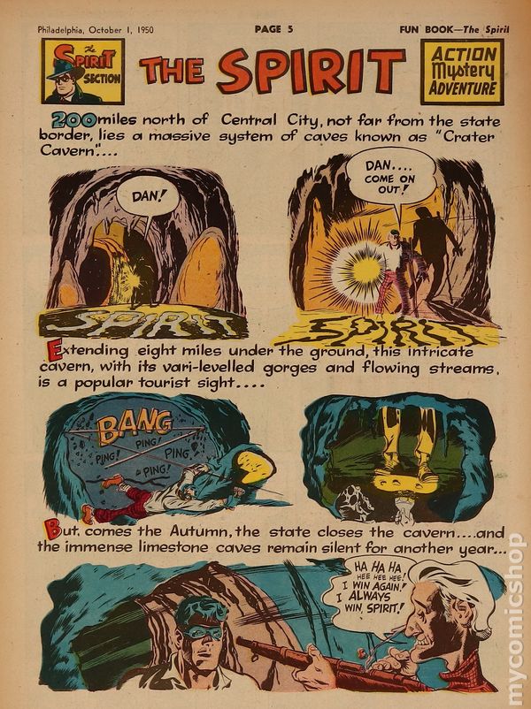 November 19, 1950. Spirit Weekly Newspaper section. Scripts by Eisner or Feiffer, or Eisner/Feiffer, or Nordling. Art by Eisner with backgrounds by Eisner, Grandenetti, Le Blanc, Stallman, Nordling, Dixon and/or others except where noted. Tabloid Sized Newsprint, 10-3/4" x 15", 8 pages, full color.