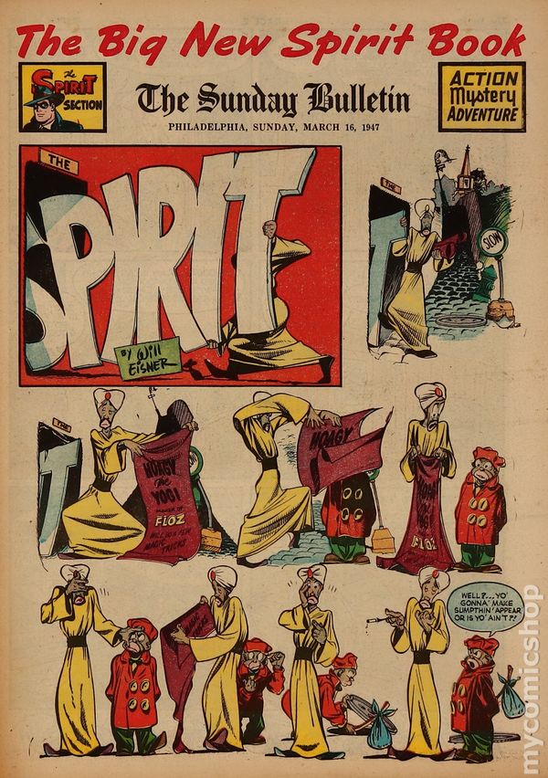 March 16, 1947. Spirit Weekly Newspaper section. Scripts, pencils/inks by Eisner except where noted. Tabloid Sized Newsprint, 10-3/4" x 15", 8 pages, full color.