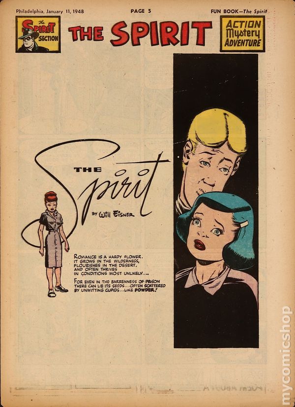 January 7, 1950. Spirit Weekly Newspaper section. Scripts by Eisner or Feiffer, or Eisner/Feiffer, or Nordling. Art by Eisner with backgrounds by Eisner, Grandenetti, Le Blanc, Stallman, Nordling, Dixon and/or others except where noted. Tabloid Sized Newsprint, 10-3/4" x 15", 8 pages, full color.