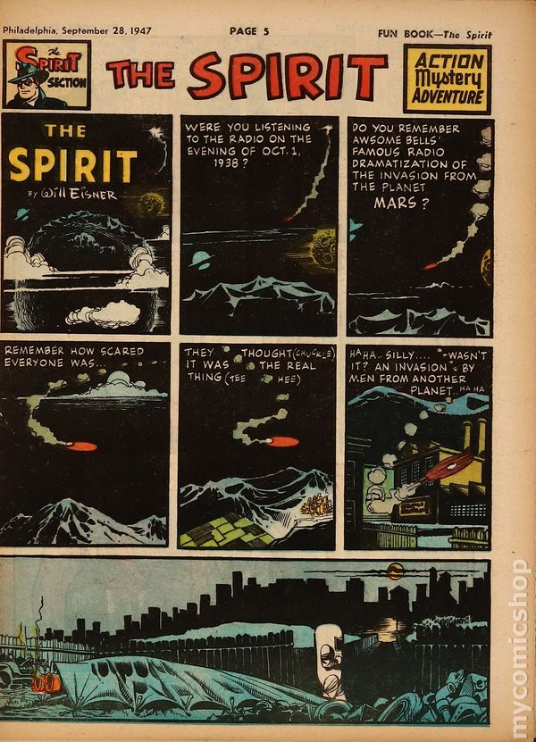 September 28, 1947. Spirit Weekly Newspaper section. Scripts, pencils/inks by Eisner except where noted. 1st mention of flying saucers in comics, three months after 1st sighting in Idaho on 6/25/47. Tabloid Sized Newsprint, 10-3/4" x 15", 8 pages, full color.