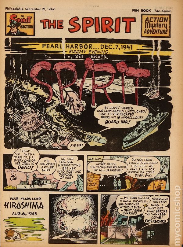 September 21, 1947. Spirit Weekly Newspaper section. Scripts, pencils/inks by Eisner except where noted. Pearl Harbor flashback. Tabloid Sized Newsprint, 10-3/4" x 15", 8 pages, full color.
