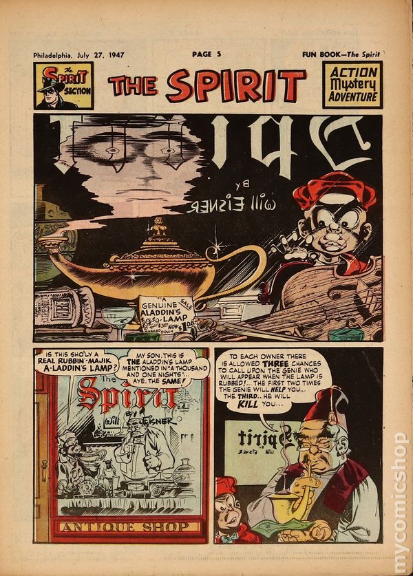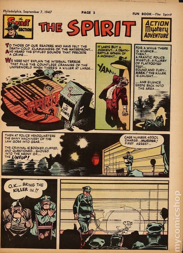January 5, 1947. Spirit Weekly Newspaper section. Scripts/layouts by Eisner, Eisner/Nordling, Eisner/Mercer, or Spranger/Eisner; inks by Eisner or Eisner/Spranger. Tabloid Sized Newsprint, 10-3/4" x 15", 8 pages, full color.