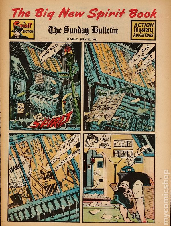 January 19, 1947. Spirit Weekly Newspaper section. Scripts/layouts by Eisner, Eisner/Nordling, Eisner/Mercer, or Spranger/Eisner; inks by Eisner or Eisner/Spranger. Tabloid Sized Newsprint, 10-3/4" x 15", 8 pages, full color.