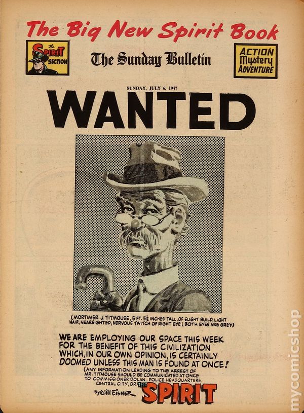 April 1, 1950. Spirit Weekly Newspaper section. Scripts by Eisner or Feiffer, or Eisner/Feiffer, or Nordling. Art by Eisner with backgrounds by Eisner, Grandenetti, Le Blanc, Stallman, Nordling, Dixon and/or others except where noted. Tabloid Sized Newsprint, 10-3/4" x 15", 8 pages, full color.
