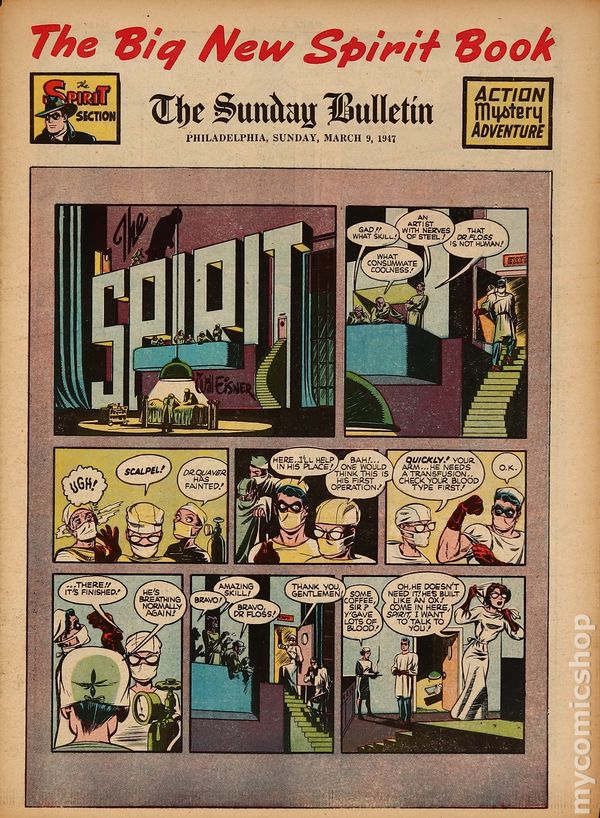 March 9, 1947. Spirit Weekly Newspaper section. Scripts, pencils/inks by Eisner except where noted. Tabloid Sized Newsprint, 10-3/4" x 15", 8 pages, full color.