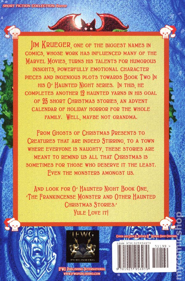 Volume 2 - 1st printing. "I Saw Mommy Killing Santa Claus and Other Creepy Christmas Stories!" Written by Jim Krueger. Art and cover by John K Snyder III. Comic-book A-lister, JIM KRUEGER, returns with a second volume of creepy compliments of the celebratory season in prose story form! From "I SAW MOMMY KILLING SANTA CLAUS " onwards to another eleven tales that add to his 'O Haunted Christmas Vol 1' to make an Advent Calendar of fiction when you're Home for the Horrordays! Gorgeous cover by JOHN K. SNYDER III! (design by Greg Chapman) Softcover, 120 pages, Text. Cover price $11.99.