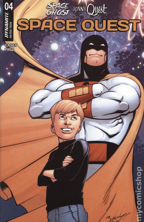 Written by Joe Casey. Art by Sebastian Piriz. Cover by Mark Spears. After evading an entire battalion of security at Area 51, Dr. Quest, Race Bannon, Jan, and Jace finally figure out how to get a signal through to Space Ghost. The good news is that the Guardian of the Spaceways is able to use it to open a portal that takes the Phantom Cruiser back to Earth. The bad news is that the portal also brings one of Dr. Nightmare's mechanical beasts with it! Grown-up adventurers JOE CASEY and SEBASTIÁN PÍRIZ pull out all the stops for the thrilling finale of their cosmos-spanning crossover in Space Ghost/Jonny Quest: Space Quest #4 commemorated by carefully curated covers from MARK SPEARS, JOSHUA MIDDLETON, DERRICK CHEW, BEN OLIVER, and CHAD HARDIN! 32 pages, full color. Rated T Cover price $4.99.