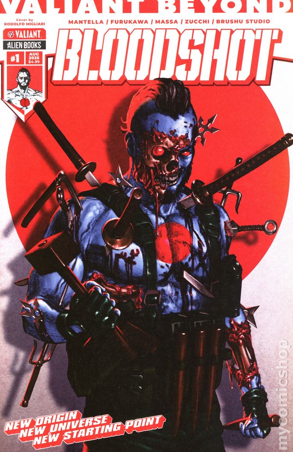 Written by Mauro Mantella. Art by Fernando Heinz Furukawa. Cover by Rodolfo Migliari. A NEW ERA OF SUPERHERO STORYTELLING BEGINS HERE! Designed as the ULTIMATE jumping-on point, the Valiant Beyond line of comics are ABSOLUTE must-reads that will ENERGIZE your love for superheroes! A powerful new drug is unleashed on Japan and has set the underworld ablaze! There's only one force strong enough to stop the B-S... and he's not looking for an invitation to start kicking butt! It's Bloodshot like you've never seen him before in this all-new cutting-edge series from writer Mauro Mantella (BLOODSHOT UNLEASHED: RELOADED) and artist Fernando Heinz Furukawa (X-O MANOWAR: INVICTUS)! Get ready to sink your teeth into 28 pages of action and chaos in this special introductory-priced issue! 28 pages, full color. Rated M Cover price $3.99.