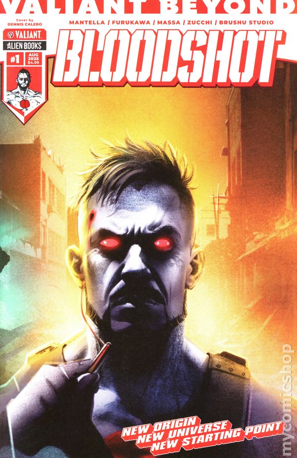 Written by Mauro Mantella. Art by Fernando Heinz Furukawa. Cover by Dennis Calero. A NEW ERA OF SUPERHERO STORYTELLING BEGINS HERE! Designed as the ULTIMATE jumping-on point, the Valiant Beyond line of comics are ABSOLUTE must-reads that will ENERGIZE your love for superheroes! A powerful new drug is unleashed on Japan and has set the underworld ablaze! There's only one force strong enough to stop the B-S... and he's not looking for an invitation to start kicking butt! It's Bloodshot like you've never seen him before in this all-new cutting-edge series from writer Mauro Mantella (BLOODSHOT UNLEASHED: RELOADED) and artist Fernando Heinz Furukawa (X-O MANOWAR: INVICTUS)! Get ready to sink your teeth into 28 pages of action and chaos in this special introductory-priced issue! 28 pages, full color. Rated M Cover price $3.99.