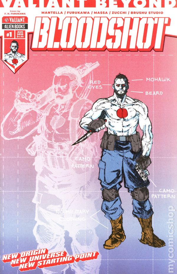 Written by Mauro Mantella. Art and Cover by Fernando Heinz Furukawa. A NEW ERA OF SUPERHERO STORYTELLING BEGINS HERE! Designed as the ULTIMATE jumping-on point, the Valiant Beyond line of comics are ABSOLUTE must-reads that will ENERGIZE your love for superheroes! A powerful new drug is unleashed on Japan and has set the underworld ablaze! There's only one force strong enough to stop the B-S... and he's not looking for an invitation to start kicking butt! It's Bloodshot like you've never seen him before in this all-new cutting-edge series from writer Mauro Mantella (BLOODSHOT UNLEASHED: RELOADED) and artist Fernando Heinz Furukawa (X-O MANOWAR: INVICTUS)! Get ready to sink your teeth into 28 pages of action and chaos in this special introductory-priced issue! 28 pages, full color. Rated M Cover price $3.99.