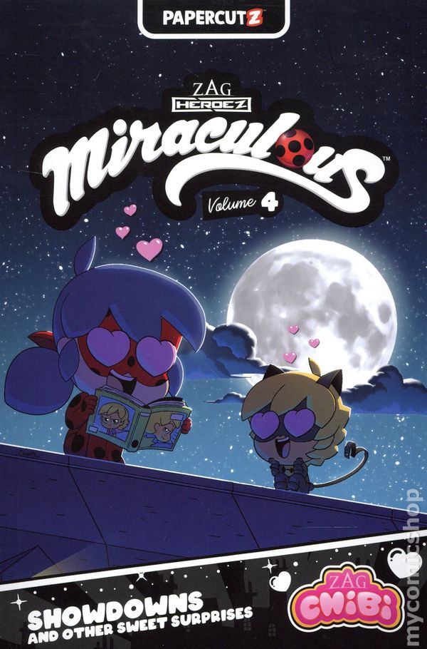 Volume 4 - 1st printing. "Showdowns and Other Sweet Surprises!" Written by Josh Trujillo and Carrie Harris. Art by Lex Hobson and Ryan Jampole. Cover by Angie Nasca. Bug out with your favorite superheroes, Ladybug and Cat Noir! Did you know, when these Parisian heroes arent watching out for akumas or guarding their secret identities – theyre baking? Sweets reign in this cake-tastic volume celebrating the release of The Official Miraculous Cookbook from Insight Editions!Then, on patrol, Ladybug enters a museum. But – whats that noise? And where is Cat Noir?! All this and more in the Miraculous Ladybug graphic novel series, influenced by the award-winning TV show and with chibi art from the Youtube shorts! Softcover, 6-in.x 9-in., 64 pages, full color. Cover price $7.99.