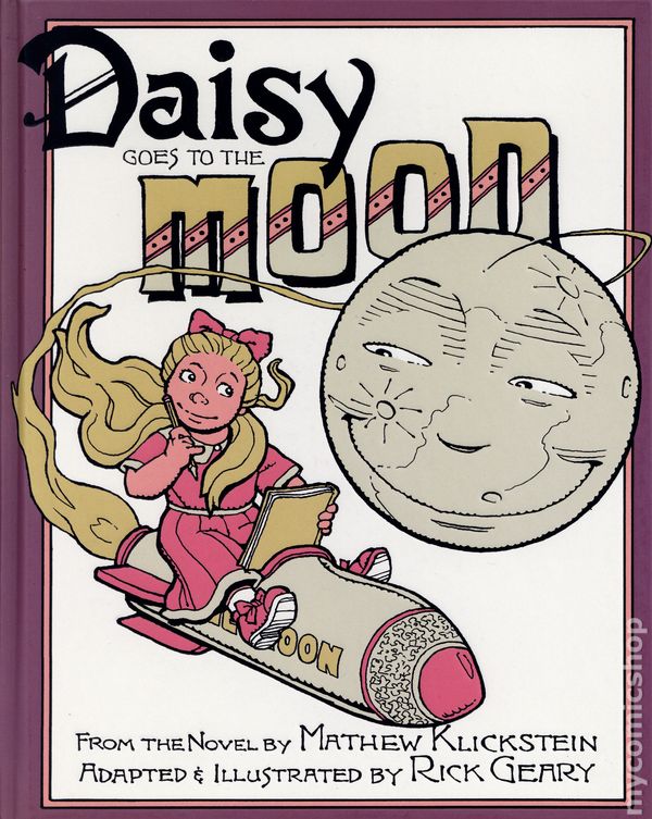 1st printing. Written by Mathew Klickstein. Art and cover by Rick Geary. In 1919, Victorian author Daisy Ashford (1881-1972) published a book she wrote at 9 years old to great success. Inspired by her imaginative adventure, writer Mathew Klickstein and cartoonist Rick Geary have created a delightful graphic novel, in which little Daisy goes to outer space, visits the cosmic automat, watches TV with a time traveler, and more! Rick Geary turns his pen from vintage true crime to whimsy in Daisy Goes to the Moon, an adaptation of a novella written by Mathew Klickstein inspired by the real-life Victorian author Daisy Ashford's successfully published juvenilia, co-written with her parents. Geary's version stars little Daisy herself and pastiches everything in his unique visual stylization from Alice in Wonderland and The Wizard of Oz to late-19th-century and early-20th-century comics: Daisy is lured to adventure by a "rokitship" as she decides to go to the moon with a man named Mr. Z. They encounter many-eyed monsters, time travelers with TVs, her duplicate, a "troobador," and more delights and vexations. Geary places his expressive, clean-line black-and-white figures, each with distinct body language, in ornate frames to denote settings and narrative layers. There's rollicking verbal and physical comedy as characters (sometimes literally) bounce off each other. Geary's rare artistic gift of being able to depict ornate period detail without sacrificing storytelling clarity or fun pairs perfectly with Klickstein's imaginative writing. Showcasing elements of Philip K. Dick, Douglas Adams, and Antoine de Saint-Exupéry, the book will delight readers as they discover Daisy's playful, madcap space adventures. Hardcover, 8-in. x 11-in., 96 pages, B&W. Cover price $19.99.