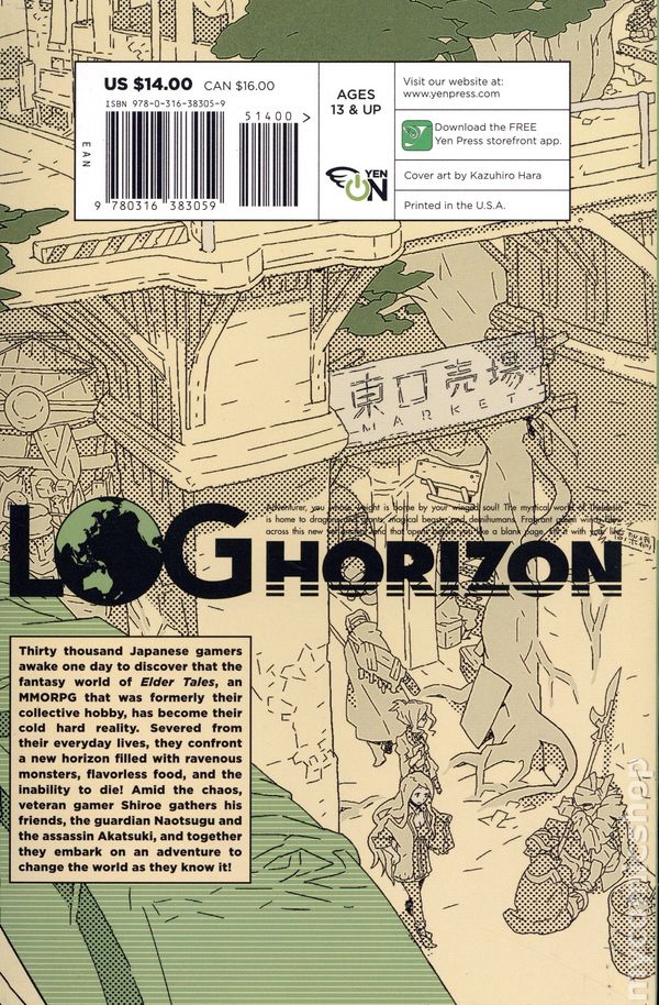 Volume 1 - 1st Printing. Written by Mamare Touno. Chapter illustrations by Kazuhiro Hara. "The Beginning of Another World!" Thirty thousand Japanese gamers awake one day to discover that the fantasy world of Elder Tales, an MMORPG that was formerly their collective hobby, has become their cold hard reality. Severed from their everyday lives, they confront a new horizon filled with ravenous monsters, flavorless food, and the inability to die! Amid the chaos, veteran gamer Shiroe gathers his friends, the guardian Naotsugu and the assassin Akatsuki, and together they embark on an adventure to change the world as they know it! Softcover, 5-in. x 7 1/2-in., 218 pages, Text (with B&W illustrations) TEEN Cover price $14.00.