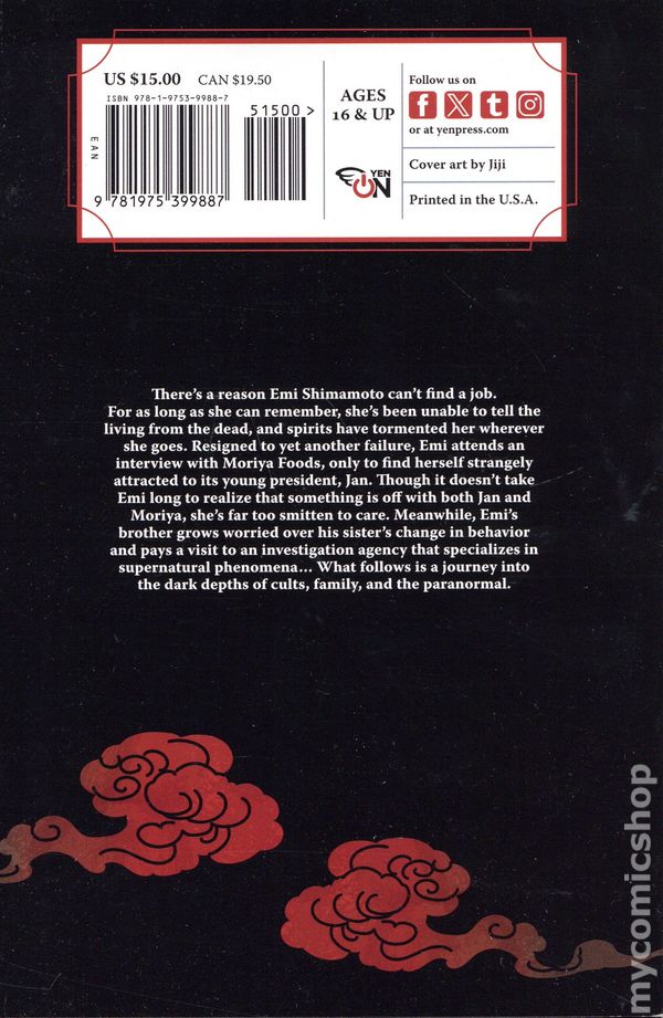 1st Printing. Written by Rokakoen. Theres a reason Emi Shimamoto cant find a job. For as long as she can remember, shes been unable to tell the living from the dead, and spirits have tormented her wherever she goes. Resigned to yet another failure, Emi attends an interview with Moriya Foods, only to find herself strangely attracted to its young president, Jan. Though it doesnt take Emi long to realize that something is off with both Jan and Moriya, shes far too smitten to care. Meanwhile, Emis brother grows worried over his sisters change in behavior and pays a visit to an investigation agency that specializes in supernatural phenomena… What follows is a journey into the dark depths of cults, family, and the paranormal! Softcover, 5 1/2-in. x 8 1/2-in., 240 pages. Cover price $15.00.