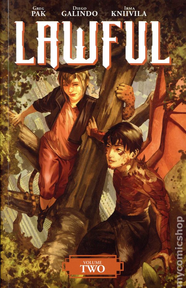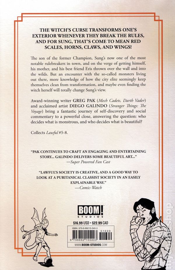 Volume 2 - 1st printing. Collects Lawful (2024 Boom) #5-8. Written by Greg Pak. Art by Diego Galindo. Cover by Qistina Khalidah. The final chapter of the fantasy epic from the creator of Mech Cadets, the inspiration behind the hit Netflix animated series! The witch's curse transforms one's exterior whenever they break the rules, and for Sung, thats come to mean red scales, horns, claws, and wings! The son of the former Champion, Sung's now one of the most notable rulebreakers in town, and on the verge of getting himself, his mother, and his best friend Eris thrown over the wall and into the wilds. But an encounter with the so-called monsters living out there, more knowledge of how the city elite seemingly keep themselves clean from transformation, and maybe even finding the witch herself will totally change Sung's view. Award-winning writer Greg Pak (Mech Cadets, Darth Vader) and acclaimed artist Diego Galindo (Stranger Things: The Voyage) bring a fantastic journey of self-discovery and social commentary to a powerful close, answering the question: who decides what is monstrous, and who decides what is beautiful? Softcover, 112 pages, full color. Cover price $16.99.