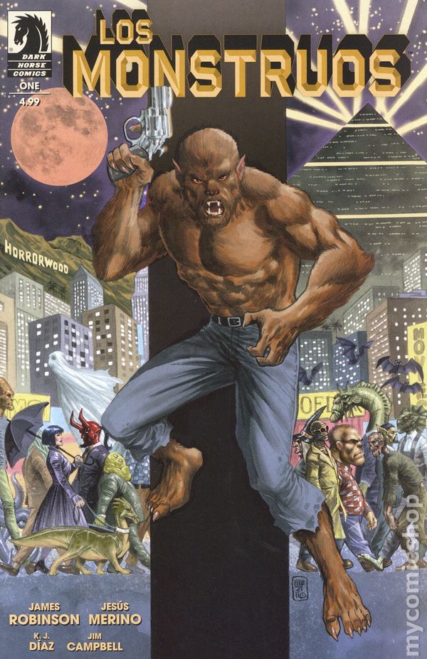 Written by James Robinson. Art by Jesus Merino. Cover by Jesus Merino. Werewolf P.I. Perry Cutters latest case should have been simple; find a missing vampiress for an old boyfriend. Yeah, at least as simple as anything can be in Los Monstruos, a city populated entirely by monsters. But now that mob boss, casino owner and living mummy Ramses Ra and vampire gang the Blood Boys are both involved, things have suddenly gone from simple to very complicated and very, very violent. Can Perry close the case plus a solve a mystery from his own past, or will he never get to see another full moon? Oh, and will he ever go on a date with Rosie, the vampire diner waitress of his dreams? In a place like Los Monstruos anything can happen!Los Monstruos is James Robinson at his best! Its a hardboiled monster wonderland filled with potential. Cant wait to see where it goes next!"—Jeff Lemire• Four issue series. 28 pages, full color. Cover price $4.99.