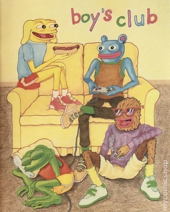 Story, Art, and Cover by Matt Furie. Cartoonist Matt Furie's deadpan comics showcase slacker roommates Andy, Brett, Landwolf, and Pepe in a series of comical vignettes combining laconic psychedelia, childlike enchantment, drug-fueled hedonism, and impish mischief. The perpetually insouciant glaze of his characters belie the sharp verbal and visual wit of Furie, who delivers a stoner classic for the Tumblr generation. In fact, Furie's wildly popular teenage weirdoes became an overnight internet sensation when Pepe the Frog was widely adopted by users of 4chan and remixed ad infinitum from there (including uses by pop stars like Nicki Minaj and Katy Perry), giving Boy's Club built-in recognition with many. 6" X 7 1/2".