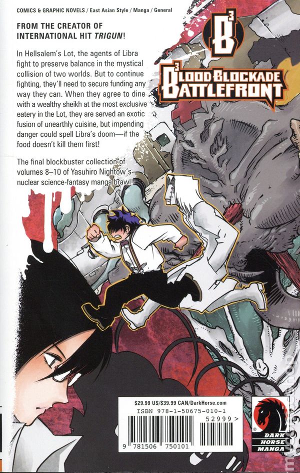 Volume 3 - 1st printing. Collects Blood Blockade Battlefront TPB (2011-2018 Dark Horse) Vol. 8–10. Story and art by Yasuhiro Nightow. Translated by Matthew Johnson. From the creator of the international hit Trigun! Yasuhiro Nightows otherworldly manga concludes in the final blockbuster collection of sci-fi fantasy madness! The agents of Libra reinforce their operations to preserve order in Hellsalem's Lot. But to continue fighting, theyll need to secure funding any way they can. When they agree to dine with a wealthy sheik at the most exclusive eatery in the Lot, they are served an exotic fusion of unearthly cuisine, but impending danger could spell Libras doom—if the food doesn't kill them first! Softcover, 5-in.x 8-in., 648 pages, B&W. Cover price $29.99.