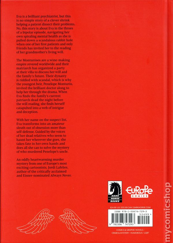 1st printing. Story and art by Jordi Lafebre. From world-famous cartoonist Jordi Lafebre, creator of the Eisner Award-nominated graphic novel Always Never, comes a murder mystery unlike any other.Eva is a brilliant Psychiatrist, but this is no simple story of a clever shrink helping a patient dissect their problems. No, this story is about Eva in the throes of a bipolar episode, navigating her own spiraling mental health as she is pulled down a scandalous rabbit hole when one of her first patients and only friends has invited her to the reading of her grandmother's living will. The Monturos are a wine-making empire revered worldwide and their matriarch has organized a party at their villa to discuss her will and the family's future. Their Dynasty is riddled with scandal, which is why the youngest heir, Penelope Monturo, invited the brilliant doctor along to help her through the drama. When Eva finds the families' current patriarch dead the night before the will reading, she finds herself catapulted into a web of intrigue and deception. With her name on the suspect list, Eva transforms into an amateur sleuth out of obsession more than self-defense. Guided by the voices of her dead relatives who seem to haunt her wherever she goes, she takes fate in her own hands and does all she can to solve the mystery of who murdered Penelope's uncle. An oddly heartwarming murder mystery from one of Europe's most exciting cartoonist, Jordi Lafebre, author of the critically acclaimed and Eisner-nominated Always Never. Hardcover, 112 pages, full color. Cover price $24.99.