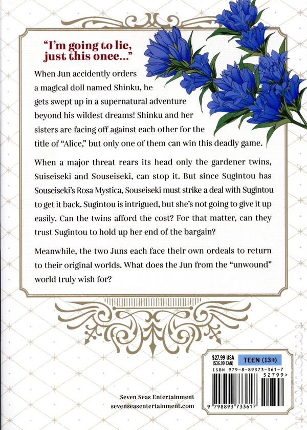 Volume 5 - 1st printing. Story and art by Peach-Pit. Translated by Minna Lin. IM GOING TO LIE, JUST THIS ONCE... When Jun accidentally orders a magical doll named Shinku, he gets swept up in a supernatural adventure beyond his wildest dreams! Shinku and her sisters are facing off against each other for the title of Alice, but only one of them can win this deadly game. When a major threat rears its head only the gardener twins, Suiseiseki and Souseiseki, can stop it. But since Sugintou has Souseisekis Rosa Mystica, Souseiseki must strike a deal with Sugintou to get it back. Sugintou is intrigued, but she's not going to give it up easily. Can the twins afford the cost? For that matter, can they trust Sugintou to hold up her end of the bargain?Meanwhile, the two Juns each face their own ordeals to return to their original worlds. What does the Jun from the unwound world truly wish for? Softcover, 6-in. x 8 1/2-in., 454 pages, B&W. Teen (13+) Cover price $27.99.
