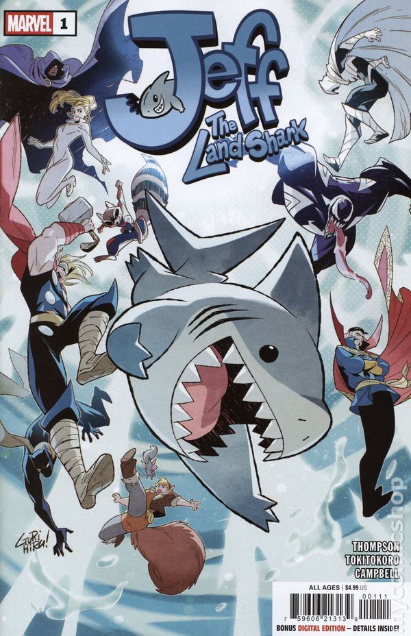 Written by Kelly Thompson. Art by Tokitokoro. Cover by Gurihiru. JEFF'S NOT DINO-ING AROUND! Jeff is portalling far and wide to catch the shadow demon tarnishing his good-boy name after wrapping up in Madripoor, but he may have bitten off more than he can chew when he ends up in the Savage Land! In a place where dinosaurs run wild, it'll take our favorite land shark and K-pop ice queen LUNA SNOW to bring the chill. 28 pgs, FC, All Ages. Cover price $3.99.