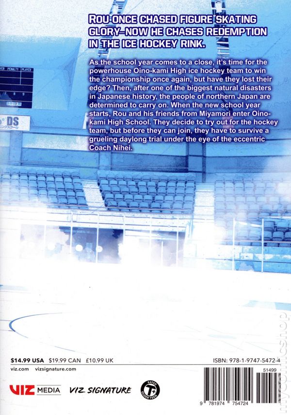 Volume 2 - 1st printing. Story and art by Satoru Noda. Translated by John Werry. As the school year comes to a close, its time for the powerhouse Oinokami High ice hockey team to win the championship once again, but have they lost their edge? Then, after one of the biggest natural disasters in Japanese history, the people of northern Japan are determined to carry on. When the new school year starts, Rou and his friends from Miyamori enter Oinokami High School. They decide to try out for the hockey team, but before they can join, they have to survive a grueling daylong trial under the eye of the eccentric Coach Nihei. Softcover, 5-in. x 7-in., 192 pages, B&W. Teen+ Cover price $14.99.