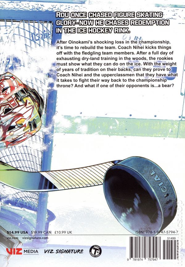 Volume 3 - 1st printing. Story and art by Satoru Noda. Translated by John Werry. After Oinokamis shocking loss in the championship, its time to rebuild the team. Coach Nihei kicks things off with the fledgling team members. After a full day of exhausting dry-land training in the woods, the rookies must show what they can do on the ice. With the weight of years of tradition on their backs, can they prove to Coach Nihei and the upperclassmen that they have what it takes to fight their way back to the championship throne? And what if one of their opponents is…a bear? Softcover, 5-in. x 7-in., 168 pages, B&W. Teen+ Cover price $14.99.