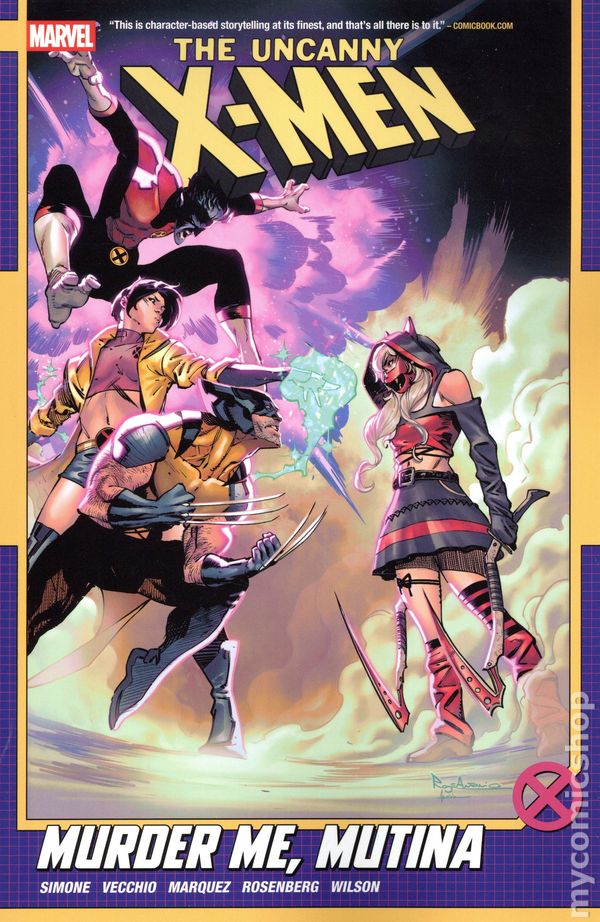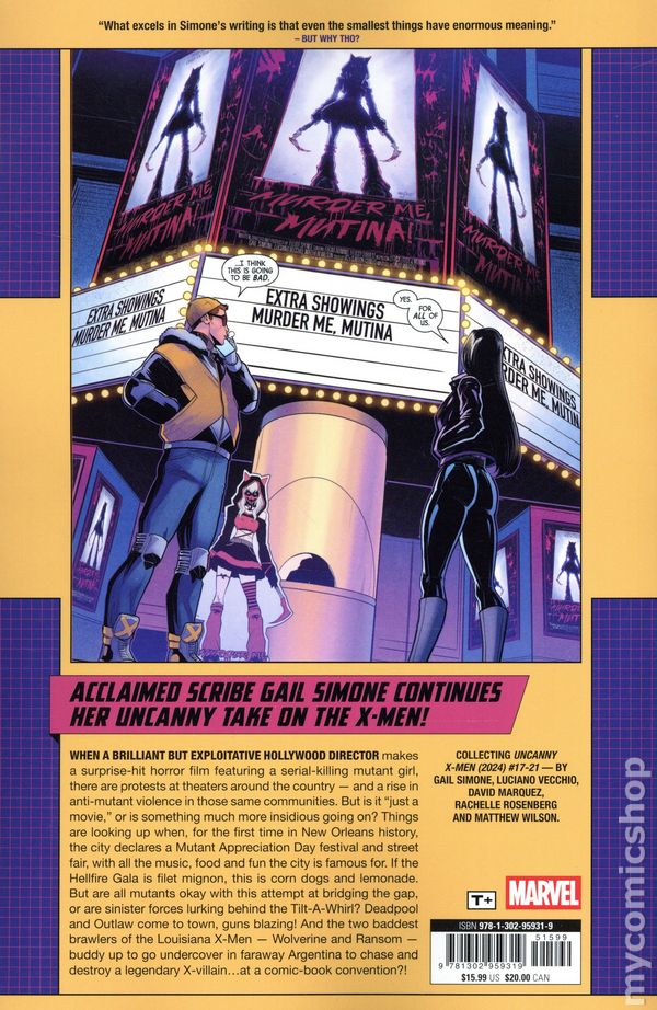 Volume 3 - 1st printing. "Murder Me, Mutina!" Collects The Uncanny X-Men (2024 Marvel) #17-21. Written by Gail Simone. Art by Luciano Vecchio and David Marquez. Cover by David Marquez. Back Cover by Luciano Vecchio. Beloved author Gail Simone continues her exciting run on Uncanny X-Men, with classic members like Rogue, Gambit, Nightcrawler, and Wolverine teaching a new group of mutants known as the Outliers how to fight the good fight! When a brilliant but exploitative Hollywood director makes a surprise-hit horror film featuring a serial-killing mutant girl, there are protests at theaters around the country and a rise in anti-mutant violence in those same communities. But is it just a movie, or is something much more insidious going on? Things are looking up when, for the first time in New Orleans history, the city declares a Mutant Appreciation Day festival and street fair, with all the music, food and fun the city is famous for. If the Hellfire Gala is filet mignon, this is corn dogs and lemonade. But are all mutants okay with this attempt at bridging the gap, or are sinister forces lurking behind the Tilt-A-Whirl? Softcover, 120 pages, full color. Rated T+ Cover price $15.99.
