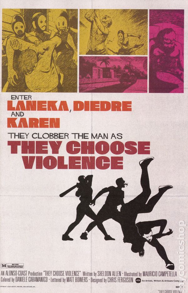 Written by Sheldon Allen. Art by Mauricio Campatella. Cover by Rahzzah. Laneka, Deidre and Karen, three HBCU besties turned professional career women, enraged by the systemic injustice plaguing their community, band together to form a vigilante squad that targets White Supremacists deemed to have circumvented the justice system and gotten away with protected murder. Serving up grisly justice in increasingly creative ways, the vigilante posse becomes front-page news while always staying one step ahead of the law. Its liberating, its addictive and its kinda fun – until a copycat killer emerges. They Choose Violence asks what happens when you go down the dark, unforgiving road of revenge? What happens when the only path forward is escalation? Theres no turning back now – for anyone. 32 pages, full color. Rated M Cover price $4.99.