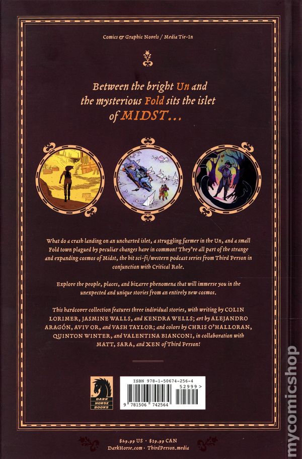 1st printing. Collects Midst: Address Unknown (2024 Dark Horse), Midst: The Valorous Farmer (2024 Dark Horse), and Midst: Ripples (2024 Dark Horse). Created by Matt Roen, Sara Wile, and Xen of Third Person. Written by Colin Lorimer, Jasmine Walls, and Kendra Wells. Art by Alejandro Aragón, Aviv Or, and Vash Taylor. Cover by William Kirkby. Third Person and Critical Role proudly present the collected edition of tales from the Midst cosmos. Between the bright Un and the mysterious Fold sits the islet of Midst... What do a crash landing on an uncharted islet, a struggling farmer in the Un, and a small Fold town plagued by peculiar changes have in common? They're all part of the strange and expanding cosmos of Midst, the hit sci-fi/western podcast series from Third Person in conjunction with Critical Role. Explore the people, places, and bizarre phenomena that will immerse you in the unexpected and unique stories from an entirely new cosmos. Includes sketchbook material. Hardcover, 160 pages, full color. Cover price $29.99.