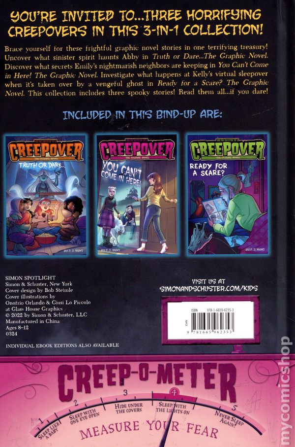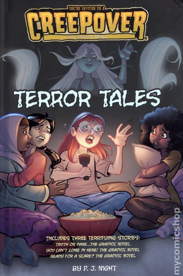 1st Printing. Collects Creepover GN Series Volume 1-3. Written by P. J. Night. Art and cover by Onofrio Orlando and Giusi Lo Piccolo. First a game of TRUTH OF DARE goes wrong when Abby Miller confesses her crush on Jake Chilson. The only people who know her secret are her friends at the sleepover-and whoever sent her a text message in the middle of the night warning her to stay away from Jake...or else! But Abby isn't going to stay away from Jake, especially not after he asks her to the school dance. As the night of the dance comes closer, some very creepy things start happening to Abby. Someone definitely wants to keep her away from Jake. Is it a jealous classmate or, as Abby begins to suspect, could it be a ghost? Then, Emily Hunter loves hanging out with her new neighbors. From their decked-out rec room to their almost-professional guitar playing, Drew and Vicky Strig are super cool. Since Drew and Vicky are homeschooled, Emily's other friends haven't gotten to know them yet. So Emily comes up with a plan for everyone to meet-a big party and sleepover at her house! But as Emily gets ready for the party, she begins to wonder about Drew and Vicky. They won't let Emily into certain rooms in their house. And a wolf howls on their lawn every night. Is it only Emily's overactive imagination or are the new neighbors more than just a little strange, or is Emily right to proclaim "YOU CAN'T COME IN HERE!"? Finally, Birthday girl and queen of all things creepy Kelly Garcia is all set to have the perfect night. Her parents are going out of town, and with just a babysitter, Kelly's practically on her own. It's the perfect time for a virtual webcam sleepover where she and her friends can scare each other silly by telling ghost stories and summoning the spirit of Miss Mary, a woman from their small town who died tragically a long time ago. But when her friends start disappearing one by one and the babysitter is nowhere to be found, Kelly starts getting scared for real. Will Kelly be the next to face the ghost's wrath, or is she READY FOR A SCARE? Hardcover, 6-in. x 10-in., 470 pages, full color.