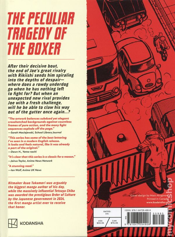 Volume 4 - 1st printing. Written by Asao Takamori. Art and cover by Tetsuya Chiba. A massive cultural phenomenon, made even bigger by the hit anime based on it. To this day, "Ashita no Joe" remains one of the most important manga of all time, and now it will finally see the light of day in English for the first time! THE PECULIAR TRAGEDY OF THE BOXER. After their decisive bout, the end of Joe's great rivalry with Rikiishi sends him spiraling into the depths of despair—where does a rowdy underdog go when he has nothing left to fight for? But when an unexpected new rival provides Joe with a fresh challenge, will he be able to claw his way out of the gutter once again...? This universally acclaimed classic is much more than a sports manga: it is a cultural touchstone and a realist masterpiece, perhaps the most prominent series ever to eschew any hint of the superhuman or supernatural, yielding a keenly observed human drama that captured the hearts of an entire generation on its way to becoming a runaway bestseller. Serialized from 1968-1973, Ashita no Joe made a particular impact on college students and the working class, who saw their own experience reflected in Joe's struggle. To this day, it remains one of the most important manga ever published, and this landmark omnibus edition marks its first appearance in English translation. Hitmaker Asao Takamori was arguably the biggest manga author of his day, while the massively influential Tetsuya Chiba was awarded the prestigious Order of Culture by the Japanese government in 2024, the first manga artist ever to receive that honor. Hardcover, 6 1/4-in. x 8 1/4-in., 588 pages, B&W. Rated 16+ Cover price $59.95.