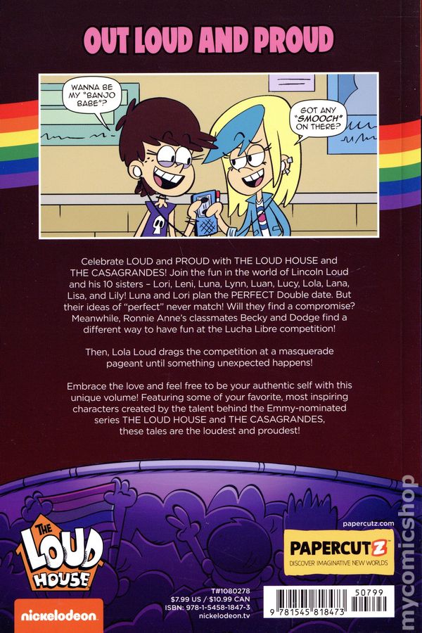 1st printing. Celebrate LOUD and PROUD with The Loud House and The Casagrandes! Join the fun in the world of Lincoln Loud and his 10 sisters – Lori, Leni, Luna, Lynn, Luan, Lucy, Lola, Lana, Lisa, and Lily! Luna and Lori plan the PERFECT Double date. But their ideas of perfect never match! Will they find a compromise? Meanwhile, Ronnie Annes classmates Becky and Dodge find a different way to have fun at the Lucha Libre competition! Then, Lola Loud drags the competition at a masquerade pageant until something unexpected happens! Embrace the love and feel free to be your authentic self with this unique volume! Featuring some of your favorite, most inspiring characters created by the talent behind the Emmy-nominated series The Loud House and The Casagrandes, these tales are the loudest and proudest! Softcover, 6-in. x 9-in., 64 pages, full color. Cover price $7.99.