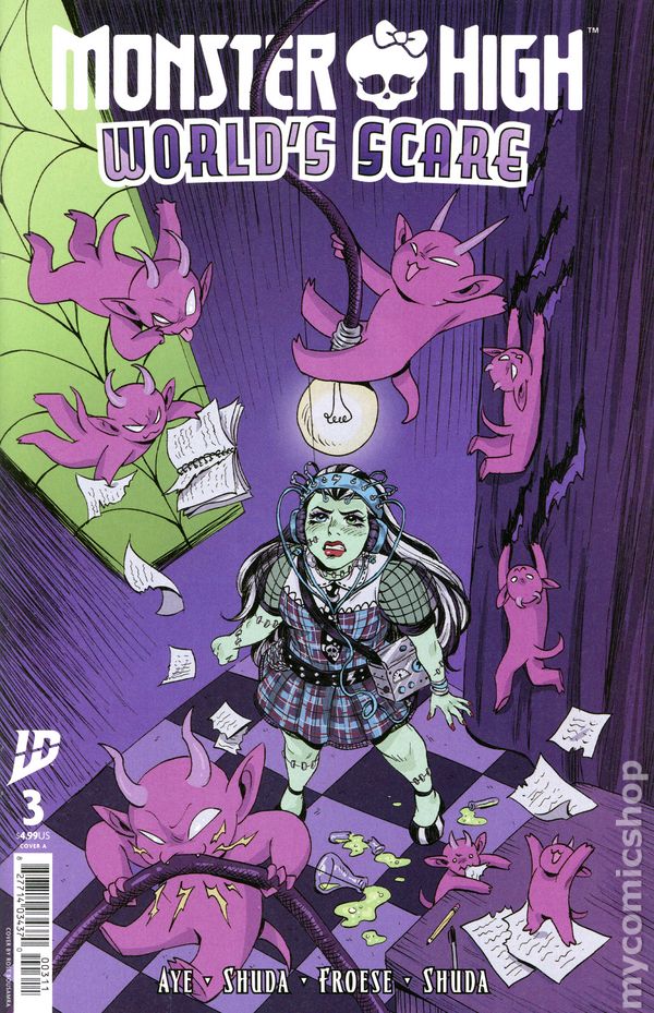 Written by Jacque Aye. Art by Caroline Shuda. Cover by Betsy Cola. Surprise, ghouls—Im baaack. Did you miss me? For those unacquainted, let me reintrobooce myself. Im Monster Highs purrmiere gossip account, CryptCrier. I know everything and everyghoul. And here is my juiciest piece of gossip yet: IDW is bringing readers a faboolous new miniseries from fang favorites Jacque Aye and Caroline Shuda, starting with a double-sized first issue. Frankie Stein, Draculaura, Clawdeen Wolf, Cleo de Nile, and Lagoona Blue are starting a new scaremester at Monster High, so this is a creeperific jumping-on point for new fangs. How eekciting.This year, the Worlds Scare is in New Salem! The brightest minds are gathering to exhibit their latest breakthroughs that could change monster-kind furever. And Monster Highs very own Frankie Stein is dreaming up something monstrous to honor her late father, Headmaster Frankenstein. With a little help from her fiends, Frankie is sure to shock the judges.—XOXO CryptCrier 44 pages, full color. Cover price $5.99.