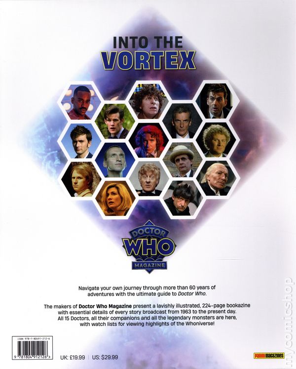 1st printing. Introduction by Marcus Hearn. The makers of Doctor Who Magazine present a lavish, 224-page bookazine in an exclusive slipcase. Into the Vortex covers the entire history of the world's longest-running science-fiction series, with details and highlights of all 311 television stories, plus sections dedicated to the series' best-known monsters, villains and other characters. Newcomers to the show will find this the perfect way to navigate the huge archive of episodes on the BBC's iPlayer, while longtime fans will find new and surprising insights into the television adventures of all 15 Doctors. Softcover (with Cardstock Slipcase), 224 pages, full color. Cover price $29.99.
