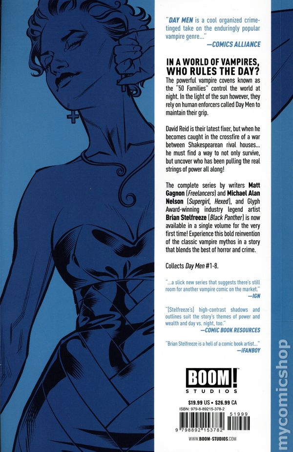 1st printing. Collects Day Men (2013 Boom) #1-8. Written by Matt Gagnon and Michael Alan Nelson. Art and cover by Brian Stelfreeze. In a world ruled by vampires, one man finds himself at the center of a war between two ancient covens, and a conspiracy that threatens to change everything... The powerful vampire covens known as the "50 Families" control the world at night. In the light of the sun however, they rely on human enforcers called Day Men to maintain their grip. David Reid is their latest fixer, but when he becomes caught in the crossfire of a war between Shakespearean rival houses... he must find a way to not only survive, but uncover who has been pulling the real strings of power all along! The complete series by writers Matt Gagnon (Freelancers) and Michael Alan Nelson (Supergirl, Hexed), and Glyph Award-winning industry legend artist Brian Stelfreeze (Black Panther) is now available in a single volume for the very first time! Experience this bold reinvention of the classic vampire mythos in a story that blends the best of horror and crime. Softcover, 224 pages, full color. Cover price $19.99.